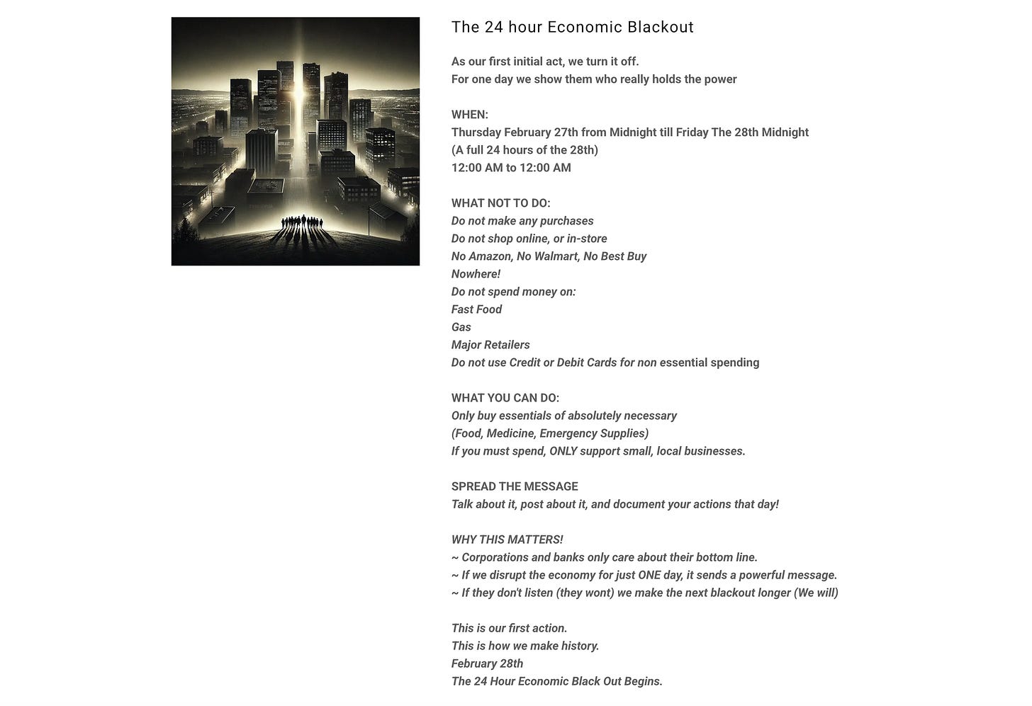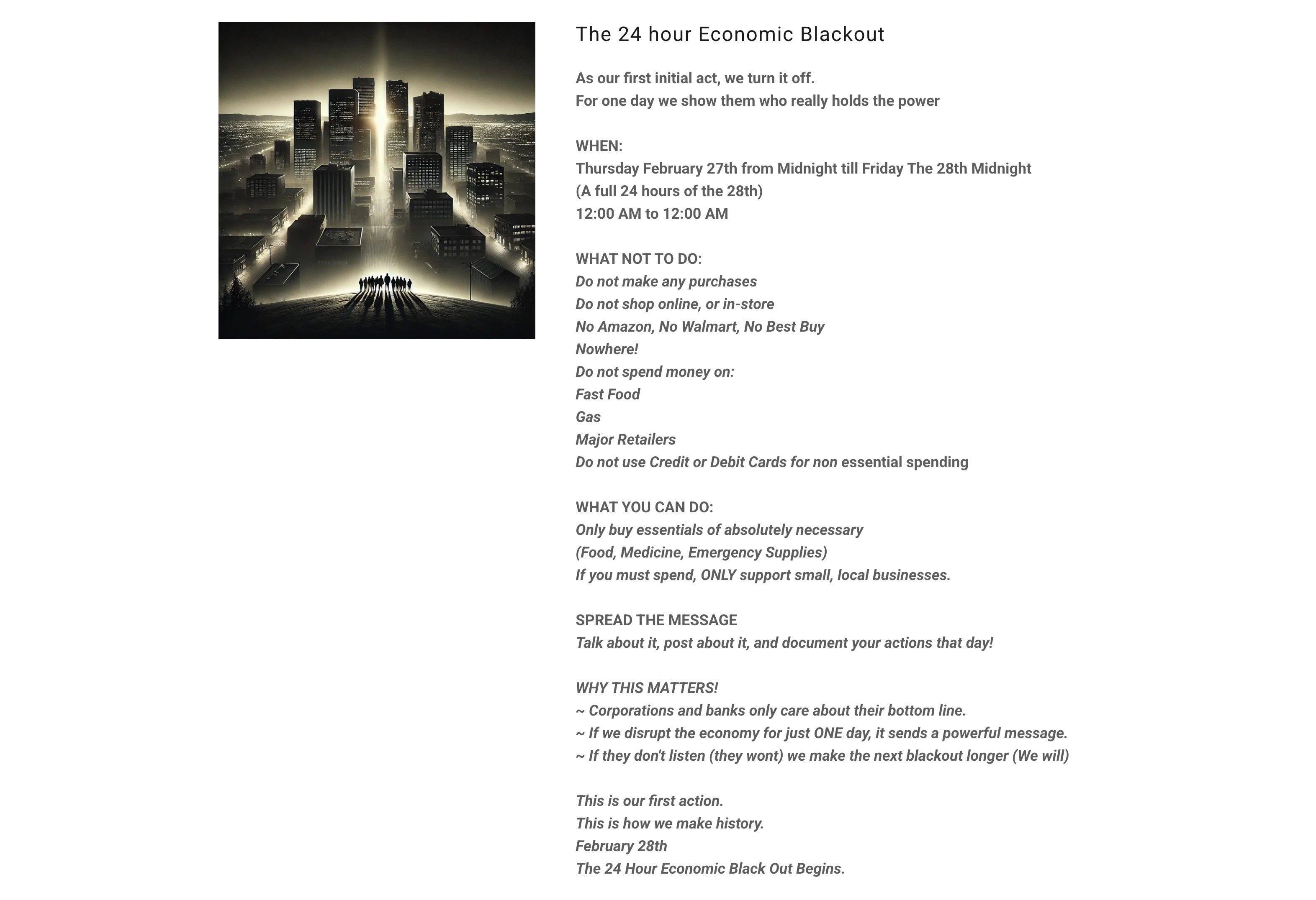 First stop? I know you hate me continuing this conversation, but it’s follow our money. It’s our power. So, on The Twenty Four Hour Economic Blackout. Friday, February 28th, it’s our chance to make headlines. Collectively. One day of not spending one dime anywhere except for local businesses and emergency needs. One day. I think we can all agree that when I suggested we stop ordering from Amazon at all, well, it didn’t go over well. But this is different. One day! And then a month later, it’s going to be three days. And then a month later, five days. Tapering into a wake up call they will all hear.