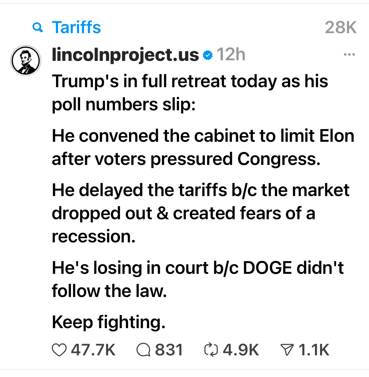 The Lincoln Project posted this last night. 3/7. And, shout out to SBC, who has argued with me consistently about the benefits of calling congress and stating your concerns. …. Limiting Elon’s power? We’ll see. There are things ‘said’ for show and things that are actually in the making.