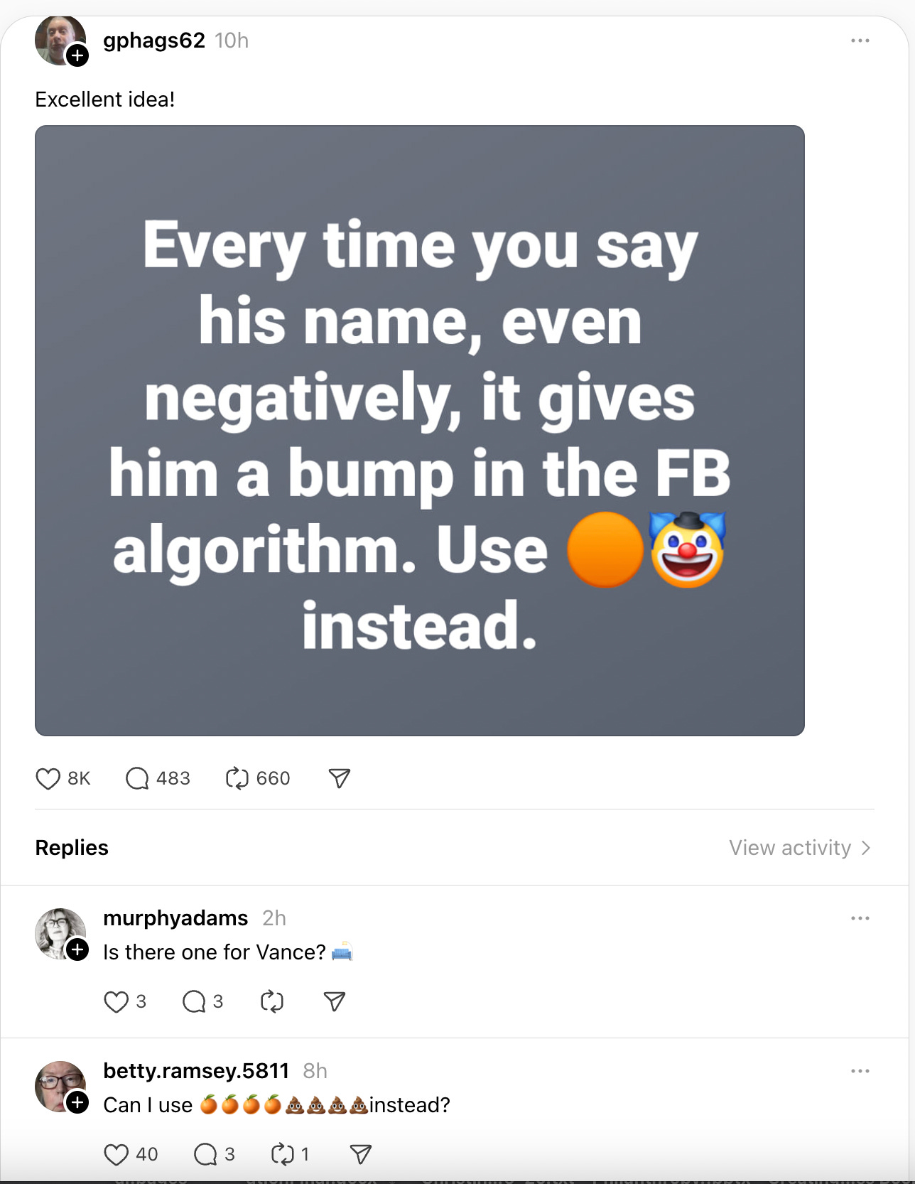 How about we stop talking about them like this post on Threads does? This will not make them want to walk to the other side of the aisle. Here’s a visual. Imagine the two party sides in the Capitol’s House Chambers. We see them sitting during the State of the Union every year, clapping for their side. Imagine instead, one side was jeering the other, laughing and pointing as they fell toward failure. Would that make them want to join and unite?