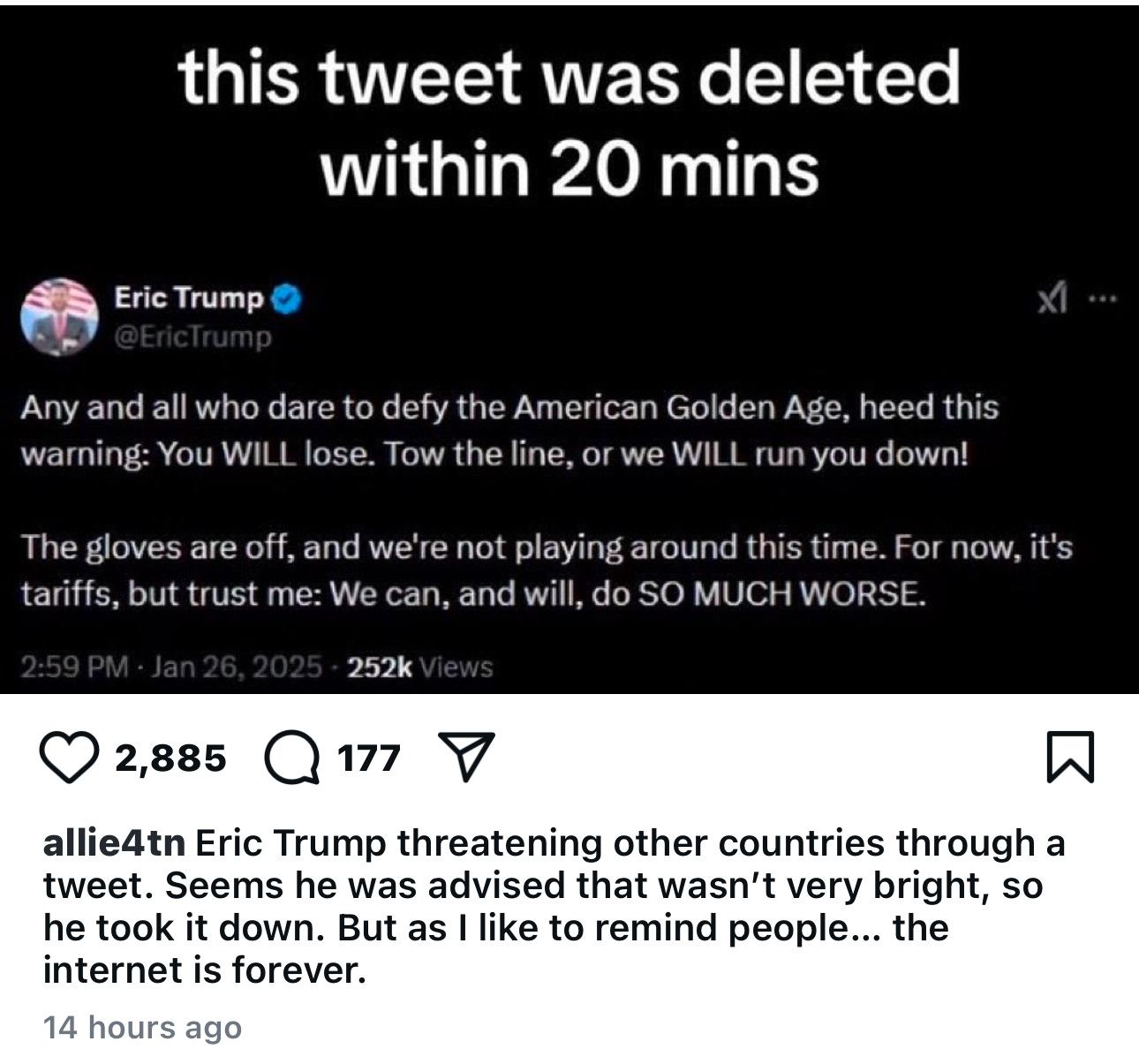 But the most chilling thing in the last seven days is the tweet by Eric Trump, which he deleted twenty minutes after posting. (That should scare you too.)